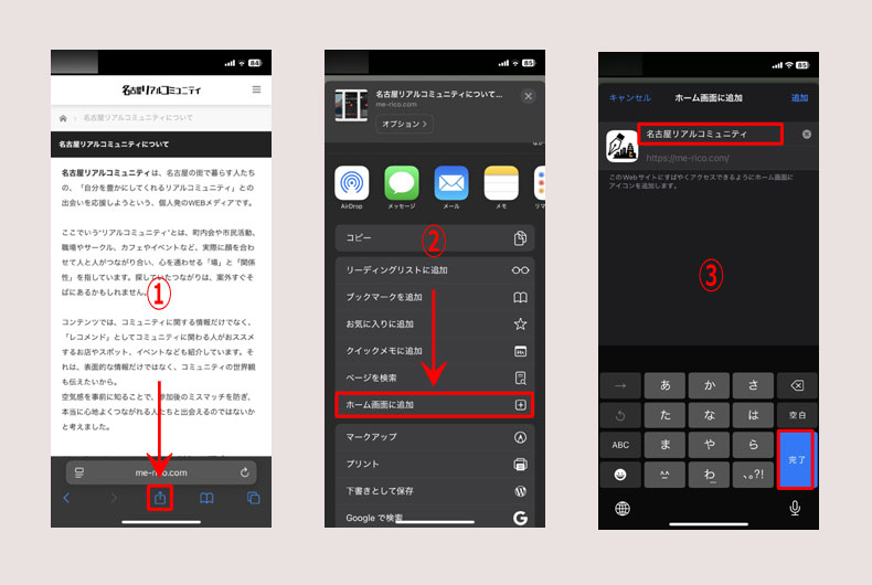 - 展開されるメニューから「ホーム画面に追加」をタップ